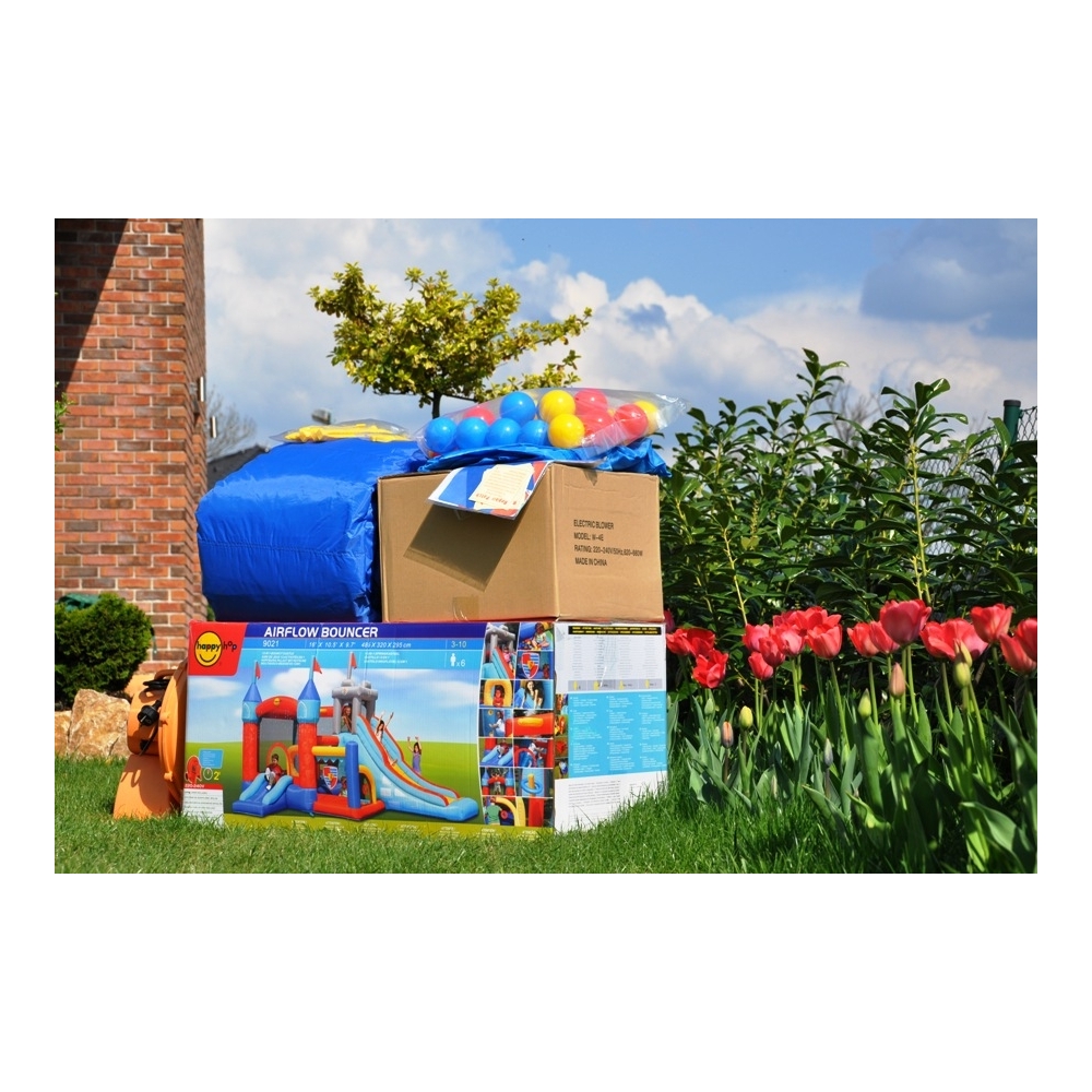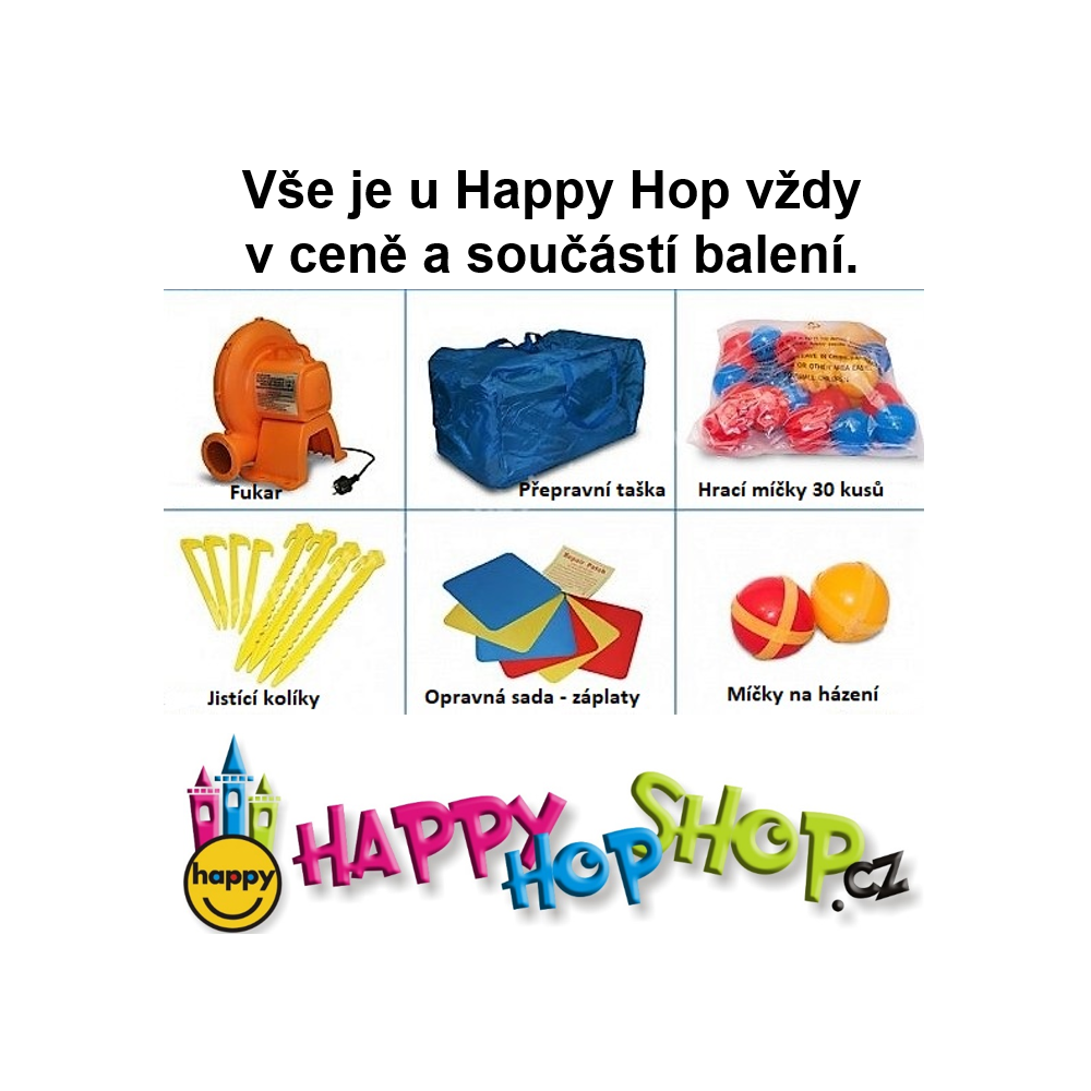 Součástí každého balení Happy Hop je vždy fukar, obal na nafukovací atrakci, opravná sada a kolíky.