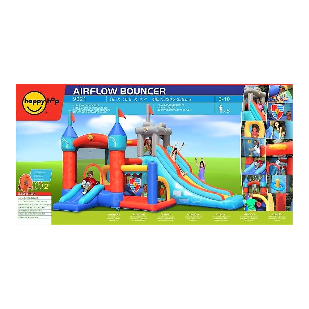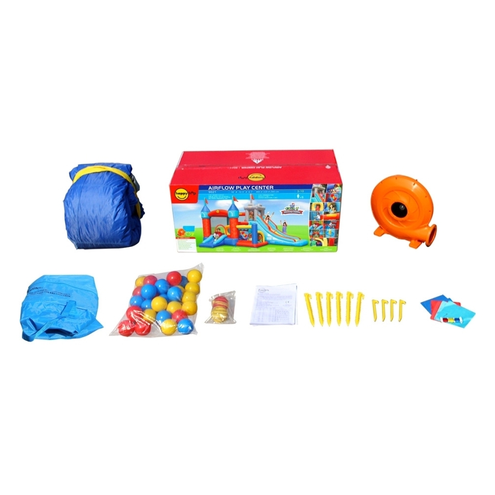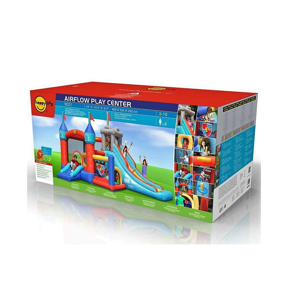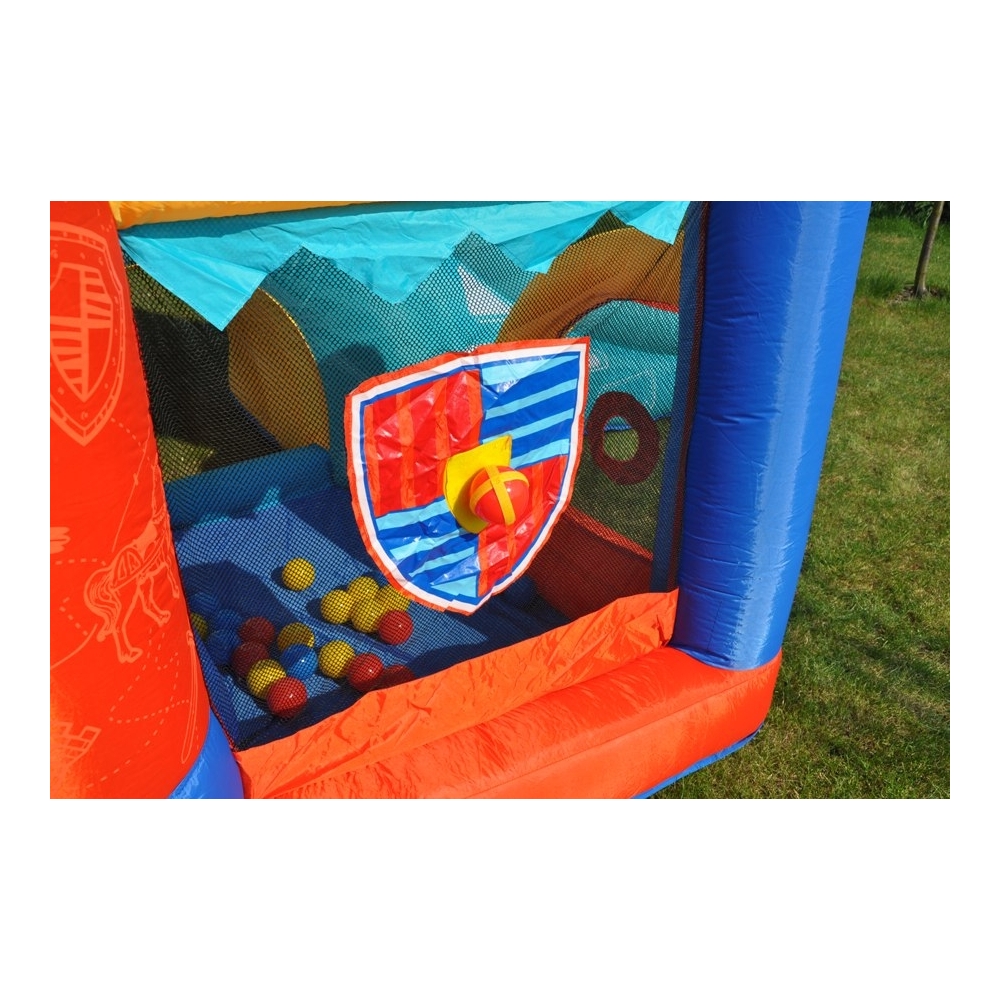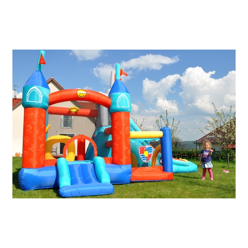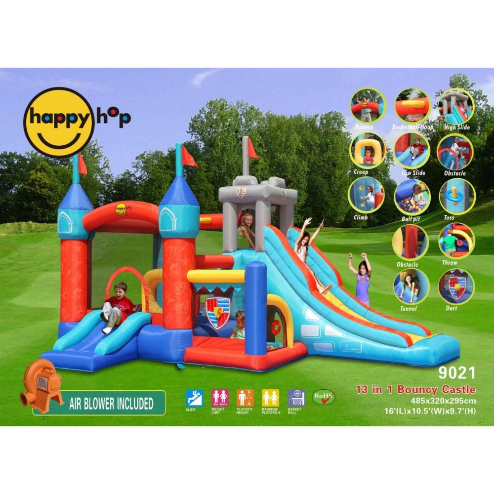 Praktické balení skákacího hradu Happy Hop Multifunkční hrací centrum 13 v 1 Rytířský hrad obsahuje.