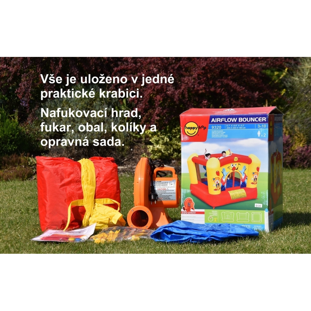 Součástí každého balení Happy Hop je vždy fukar, obal na nafukovací atrakci, opravná sada a kolíky.